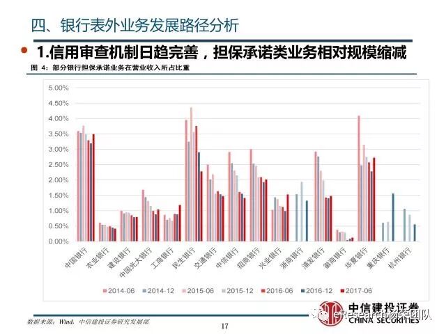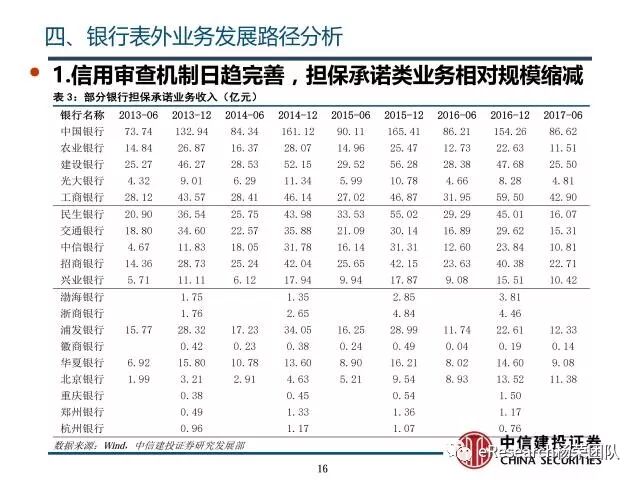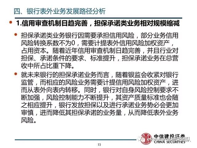 ①随着银监会收紧对银行监管,相应的风险业务需要计提信用风险加权资产,商业银行对担保承诺等业务信用审查机制日趋完善,担保承诺类业务的业务所占比重会不断收缩,其相对规模会不断下降;