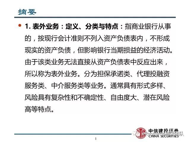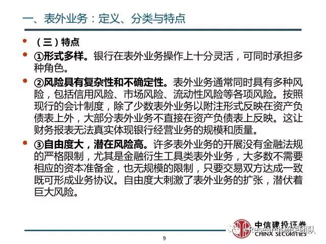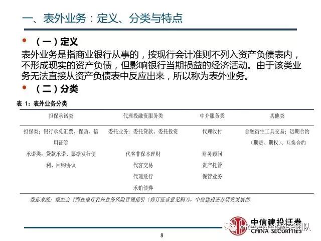来源:eResearch杨荣团队作者:中信建投证券银行业首席杨荣核心观点1、表外业务:定义、分类与特点:指商业银行从事的,按现行会计准则不列入资产