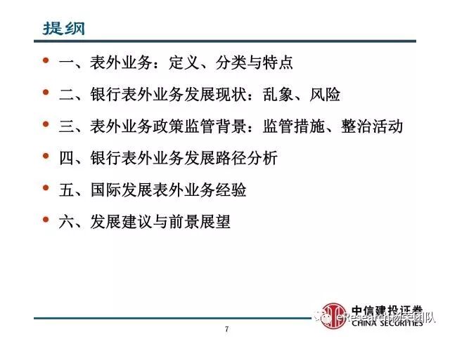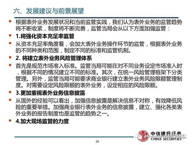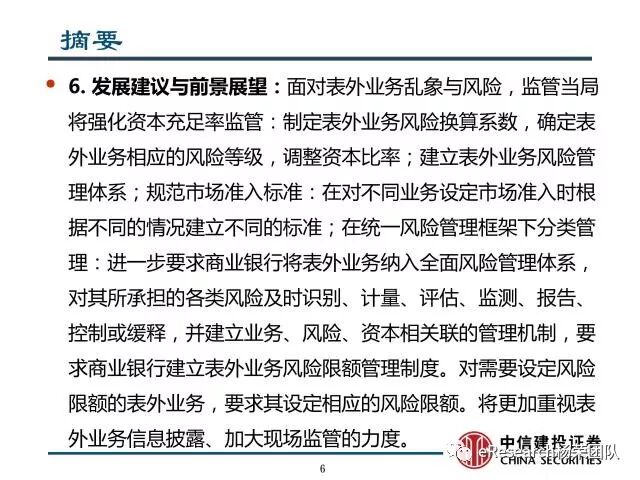 6、发展建议与前景展望:面对表外业务乱象与风险,监管当局将强化资本充足率监管:制定表外业务风险换算系数,确定表外业务相应的风险等级,调整资本比率;建立表外业务风险管理体系;规范市场准入标准:在对不同业务设定市场准入时根据不同的情况建立不同的标准;在统一风险管理框架下分类管理:进一步要求商业银行将表外业务纳入全面风险管理体系,对其所承担的各类风险及时识别、计量、评估、监测、报告、控制或缓释,并建立业务、风险、资本相关联的管理机制,要求商业银行建立表外业务风险限额管理制度。对需要设定风险限额的表外业务,要求其设定相应的风险限额。将更加重视表外业务信息披露、加大现场监管的力度。