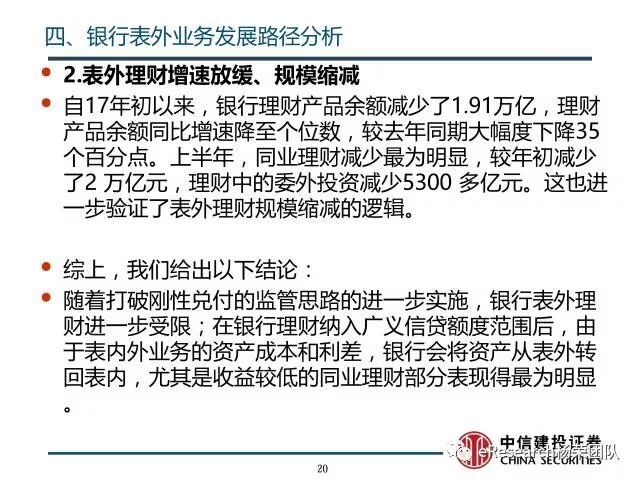 ②随着打破刚性兑付的监管思路的进一步实施,银行表外理财进一步受限;在银行理财纳入广义信贷额度范围后,由于表内外业务的资产成本和利差,银行会将资产从表外转回表内,尤其是收益较低的同业理财部分表现得最为明显。表外理财业务规模会不断下降,资金回转入表内信贷业务;