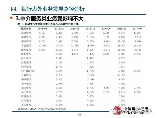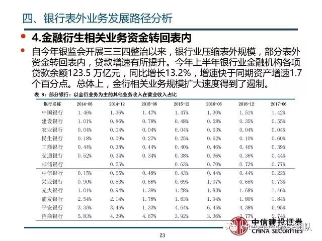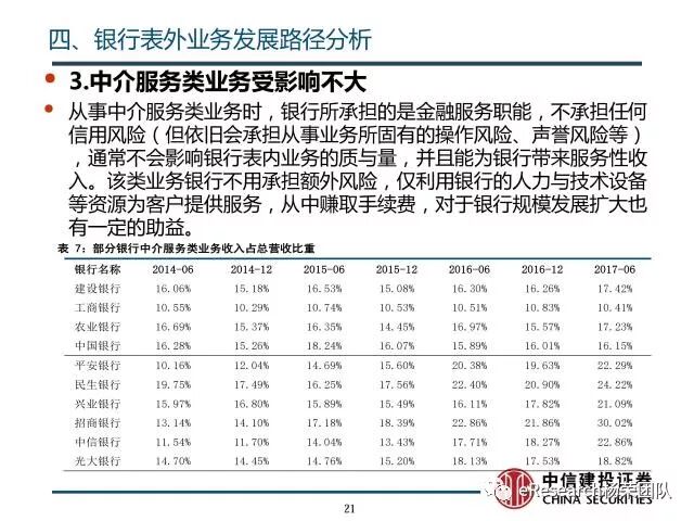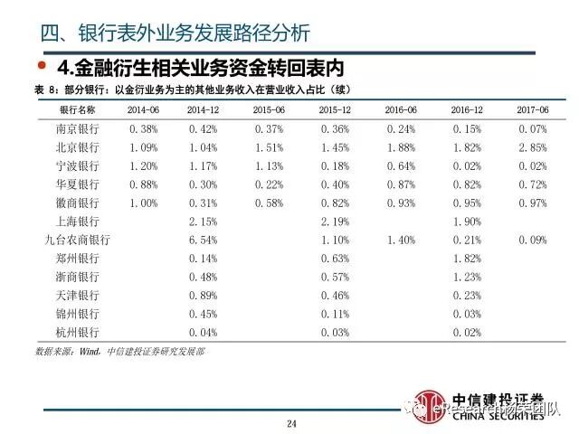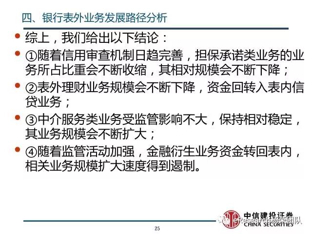 4、银行表外业务发展路径分析:①随着银监会收紧对银行监管,相应的风险业务需要计提信用风险加权资产,商业银行对担保承诺等业务信用审查机制日趋完善,担保承诺类业务的业务所占比重会不断收缩,其相对规模会不断下降;②随着打破刚性兑付的监管思路的进一步实施,银行表外理财进一步受限;在银行理财纳入广义信贷额度范围后,由于表内外业务的资本成本和利差,银行会将资产从表外转回表内,尤其是收益较低的同业理财部分表现得最为明显。表外理财业务规模会不断下降,资金回转入表内信贷业务;③中介服务类业务受监管影响不大,保持相对稳定,其业务规模会不断扩大;④随着监管活动加强,金融衍生业务资金转回表内,相关业务规模扩大速度得到遏制。