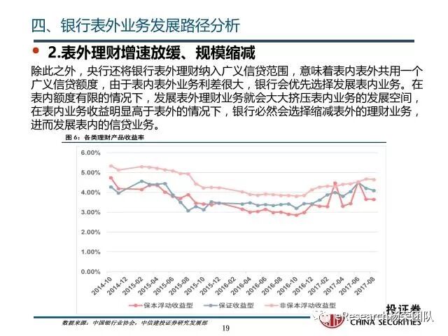 在表内表外共用一个广义信贷额度时,由于表内表外业务利差很大,银行会优先选择发展表内业务。根据中国银行业协会发布的收益率数据来看,非保本理财产品的收益率高于保本型理财产品的收益率。意味着银行经营表外非保本理财产品所需要的成本大于表内保本型理财产品的成本。表外业务的非保本理财利差小于表内业务的保本理财的利差。在表内额度有限的情况下,发展表外理财业务就会大大挤压表内业务的发展空间,在表内业务收益明显高于表外的情况下,银行必然会选择缩减表外的理财业务,进而发展表内的信贷业务。而随着银监会打破刚性兑付的要求收紧,表内保本理财产品资金会流向其他表内的信贷业务如消费信贷等。由于保本理财产品仍存在客户需求,在当下依然存在一定的生存空间。