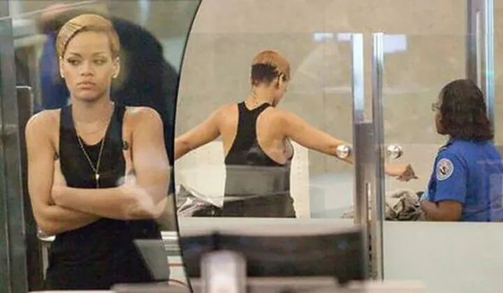 在机场,没有人能搞特殊,即便是一些著名的影星。图中是美国明星蕾哈娜,她也和普通人一样正在接受检查,只不过她显得一脸的无奈。