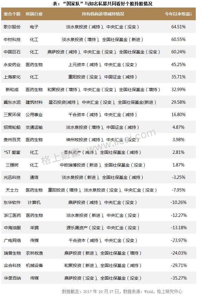 随着上市公司三季报的陆续披露,知名私募的持股路径渐渐浮出水面。格上研究中心根据Wind数据整理发现,截至10月27日,已有超过1800家上市公司披露了2017年三季报,有63家公司前十大流通股股东中出现“淡水泉投资”“千合资本”“和聚投资”等知名私募的身影,其中,与“社保基金”“中央汇金”等国家队共同持有的个股有21只。
