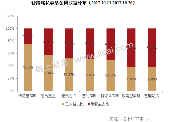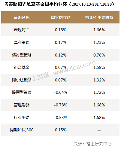 从各策略业绩表现来看,上周(2017.10.13-2017.10.20)市场环境不佳,行业平均收益仅为-0.53%。其中,宏观对冲策略夺冠,周涨幅0.18%;股票策略业绩分化严重,绩优产品收益达1.72%,排名第一,但全部产品平均收益表现较为靠后,仅为-0.64%。