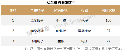 二、阳光私募机构调研动向:中小板占据私募关注度半壁江山,“歌尔股份”成私募关注焦点