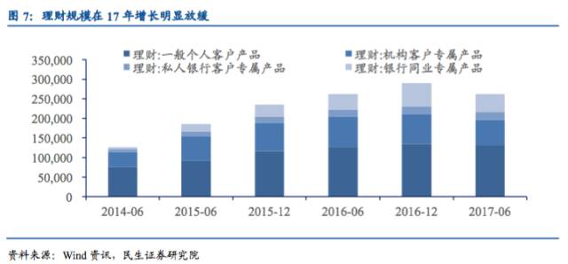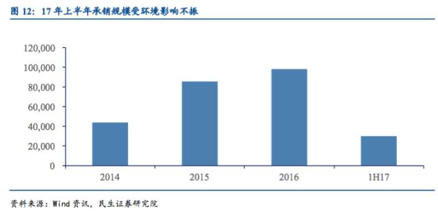 在减费让利的政策推动下,银行除了在结算方面让利外,也加大对企业收费的优惠减免力度,银行逐渐取消部分与贷款相关的部分担保承诺类收费。债券承销收入则受债市一级市场的环境影响。从WIND统计数据来看,2017年上半年银行承销规模为2.99万亿元,而16年全年承销规模约9.8万亿元,年化后规模明显下降。
