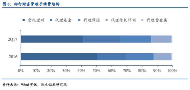 理财业务手续费来自于银行表内表外受托理财手续费收入。代理业务收入主要来源于代理基金销售、代理保险等。两者都是银行提供资产管理服务而来的手续费,我们将其统一看作财富管理收入。从招行披露的数据来看,这部分收入最主要仍来自于银行自身的理财产品,代理基金、保险及信托计划占比相近。