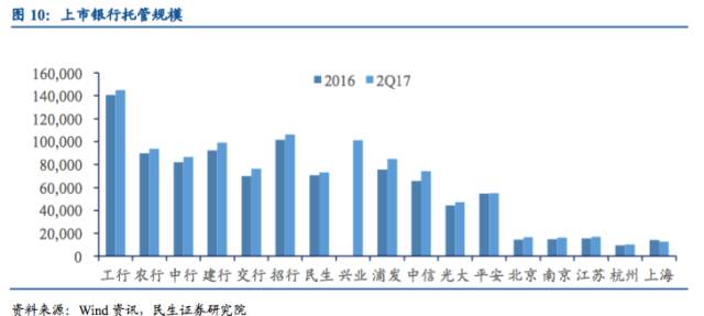 托管业务的收入主要依靠规模经济效应,中大型银行更具有优势,近年来托管资产规模保持高速增长。截至2016年末,银行业资产托管存量规模达121.9万亿元,同比增长39.03%,2010-2016年托管规模平均复合增长率达53.06%,保持高速增长。