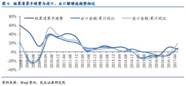 国际结算类业务受经济环境影响而波动。国际结算业务的主要印象因素是外贸业务形势与人民币汇率。从下图可以看出,结算清算手续费的同比增速与进、出口金额的增速的趋势相近。自2010年后,结算清算手续费与进出口金额增速均逐渐趋缓,考虑17年上半年进出口增速有所回升,结算清算手续费或有望回暖。