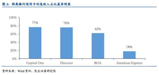 从美国大型银行来看,由于其盈利模式的不同,收入结构呈现不同情况。一类银行的主要盈利模式为利差收益,发卡行鼓励用户透支以提高卡均未偿金额,以便在免息期后获得利息收入。如Discover信用卡利息收入占比达70%以上。另一类银行是以支付为主的盈利模式,以商户收单手续费、分期付款手续费及罚息收入、年费及提现费等为主要收入。收单行参与与特约商户有关的所有环节。为获取商户收单手续费,这类银行的目标是提高客户的消费金额。如American Express的2015年信用卡利息收入仅占18%,非息收入占比达82%。