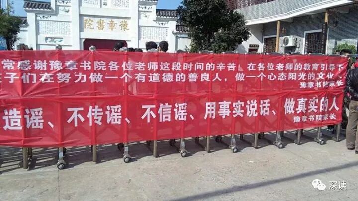 一些自称是学生家长的人还在该校门口拉起横幅和签名版,称“非常感谢豫章书院各位老师这段时间的辛苦!在各位老师的教育引导下,孩子们在努力做一个有道德的善良人,做一个心态阳光的文化人”、“不信谣不传谣,坚决支持豫章书院办学”。