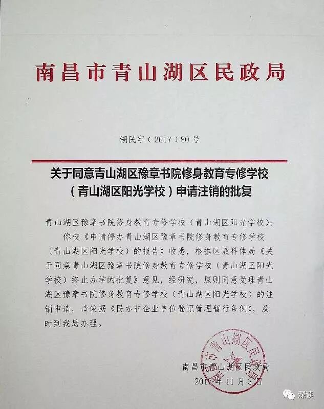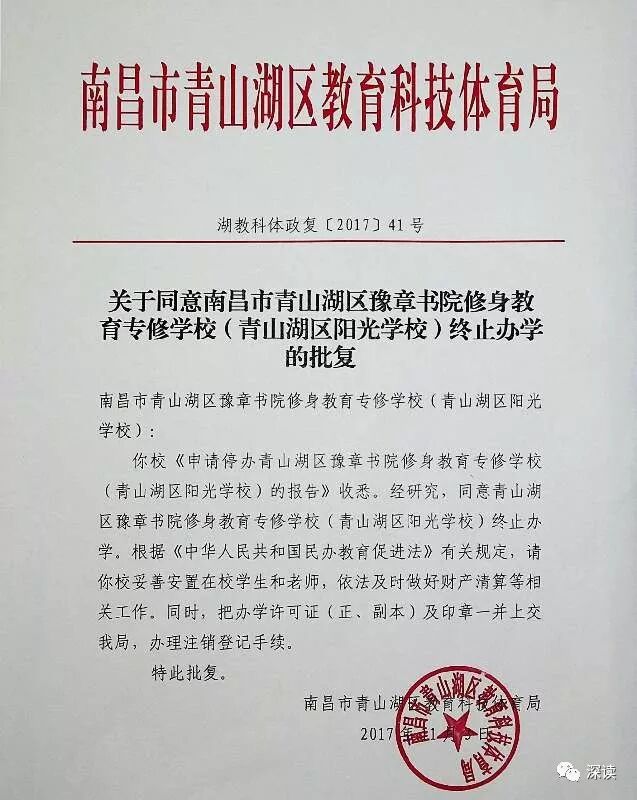 青山湖教科体局给予豫章书院申请停止办学的批复