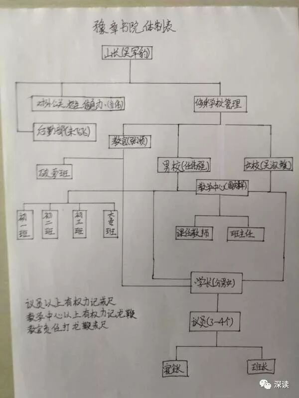 据北青报报道,山长吴军豹是书院的最高管理者,在山长之下,是男、女分校的副校长。平时,两校学生一起上课,分开住宿。副校长之下是“教学中心”,教官和老师都是管理人员。