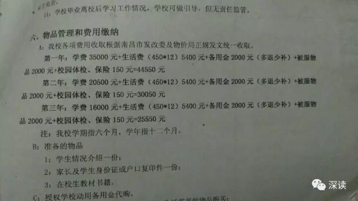 法制晚报记者获得了一份该校2014年的收费标准。其图片显示,第一年的收费为44550元,第二年30050元,第三年25550元。据一名学生称,“花费远不止这个数。”他提供的收据则显示,其半年的学杂费为31650元。