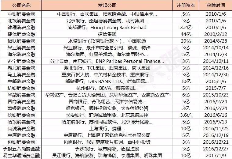 2010年,中国银监会批准成立了首批四家试点消费金融公司。当年银监会批复同意北银、中银和四川锦程三家消费金融公司筹建,作为首批机构,三家消费金融公司的发起人分别为北京银行、中国银行和成都银行。另外一家试点公司是捷信消费金融。