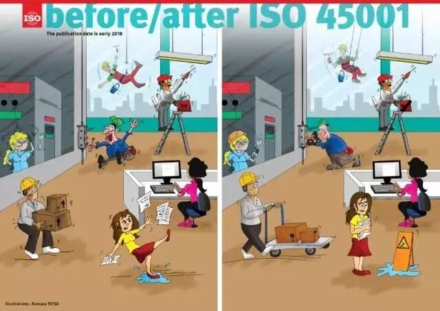 所有组织。 无论您的组织是高风险的大企业、低风险的小公司、非盈利性组织、慈善机构、学术科研机构、或者政府机关部门,只要您的组织有人员为其工作、或者因其活动而受到影响,那么您就可以采用系统的方法来管理人员的职业健康和安全。 2 应用ISO 45001对您有哪些益处? ISO 45001可以帮助组织改善职业健康安全绩效,并确保为员工提供安全的作业场所。如: 提高符合法律法规的能力 2 降低事故事件的总成本 3 减少停机时间和生产中断的成本 4 降低保险费用 5 减少误工和员工离职率 6 到国际职业健康安全管理水准的认可 3 如何应用ISO 45001? ISO 45001可以通过如下方式来加以应用: 制定和实施职业健康安全方针和目标 2 通过理解组织所处的环境、需要应对的风险和机遇,来建立系统的管理过程 3 进行危险源辨识、风险评价,并确定必要的控制措施 4 提升人员的职业健康安全意识和能力 5 评价职业健康安全绩效,寻找改善的机会并加以实施 6 确保工人在职业健康安全事务中发挥积极作用 4 ISO 45001和其他标准的关系? ISO 45001和其他ISO管理体系标准,如ISO 9001:2015(质量管理体系)和ISO 14001:2015(环境管理体系)一样采用了高阶结构。在制定标准的时候,对其他国际标准的内容给予了考虑,如OHSAS 18001、国际劳工组织的职业安全健康指南、国家标准、国际劳工标准和公约。 正是因为提前考虑了和其他标准的融合,等到ISO 45001发布之后,我们可以发现它和那些标准、指南和公约和要求是一致的。如果您现在已经建立了职业健康安全管理体系,那么今后切换到ISO 45001就相对比较容易,同时,也便于组织将职业健康安全管理要求融入和整合到总体的管理过程中去。 5 ISO 45001现在进展到什么阶段? ISO 45001第二次征求意见稿已经于2017年7月投票获得通过,标准制定和发布的大致时间进度如下: 6 ISO 45001 DIS2与DIS1相比 主要变化点有哪些? 构成ISO 45001职业健康安全体系的方法并没有发生改变,仍然沿用基于策划、实施、检查与改进(PDCA)的概念。主要的变化点包括名词与定义、要素与条款以及和其他管理体系标准的一致性等。 名词与定义: a.将之前DIS1中有争议的的三个名词包 含“worker(工作人员)“、”participation(参与)“、”hazard(危害)“做进一步的修正。例如在DIS1中对工作人员的定义包含”组织具有某些程度控制的人员“,已在DIS2中删除,以避免可能的模糊空间。 2 要素与条款: 顺序大幅度变化,便于终版ISO 45001与ISO 14001的整合 a. DIS2最大的变化在于条款8“运行的策划与控制” i. 原本在DIS1中的条款8.2“变更管理”到8.5“承包商”在DIS2中改为条款8.1.3到8.1.6 ii. 原本的8.6“应急准备与响应”预计将会改回与ISO 14001:2015相同的条款编号8.2 b. 条款10中,在DIS2中新增条款10.1“总则”,并将原本条款中10.2“持续改进“中的两个次条款10.2.1与10.2合并,改为条款10.3。 3 与其他管理体系标准的一致性: 部分会员国对于DIS1与其他管理体系在条款结构上的一致性认为有改进的必要,以便更符合ISO/IEC Directive, Part 1中的Appendix 2内容。例如将DIS1中条款5.3中的“accountability“,以及7.4中的”information“删除。另外,与ISO 14001:2015新版的高度一致性,也是这次DIS2最大的改变之一。