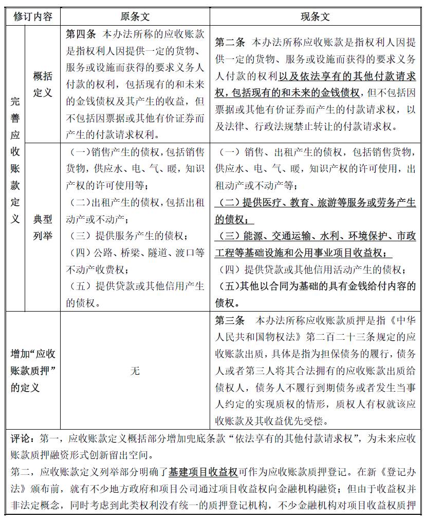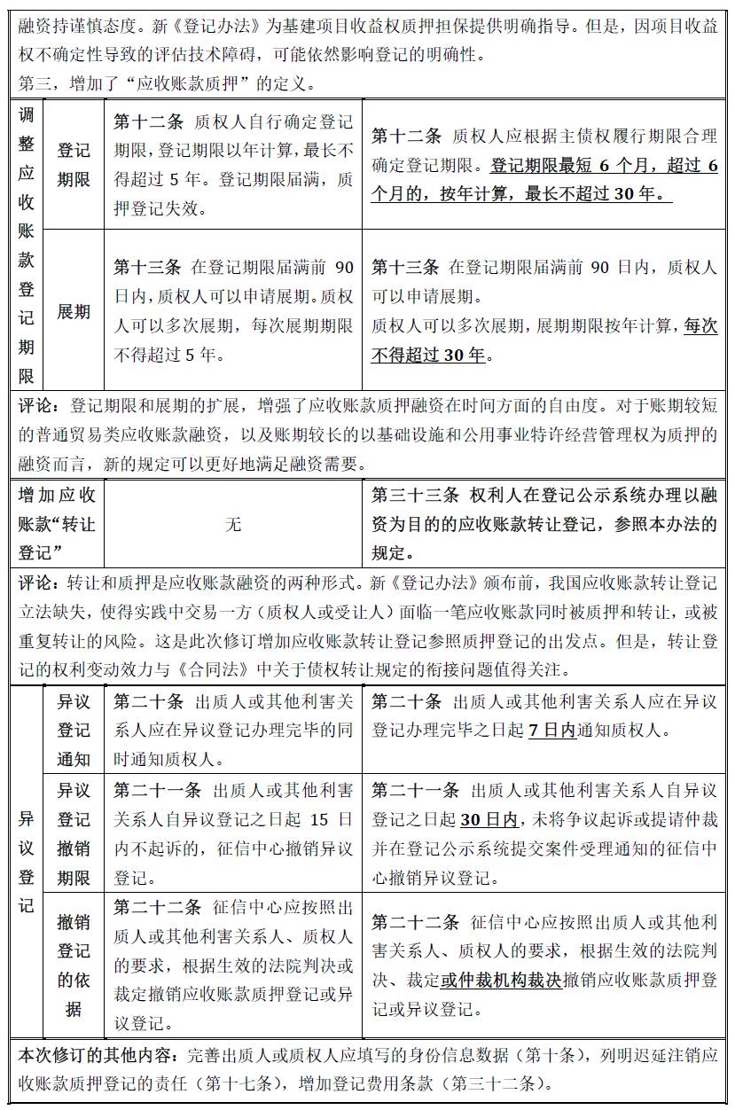 2017年10月25日,央行颁布了新修订的《应收账款质押登记办法》(中国人民银行令[2017]第3号),新《登记办法》将于2017年12月1日起施行。新《登记办法》主要在以下方面作出了修改和调整:完善应收账款定义,明确将基建项目收益权纳入应收账款质押登记的范围,调整应收账款质押登记的期限,以及应收账款转让登记参照执行等。