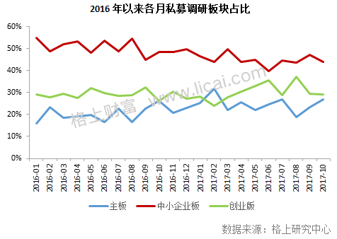 本月正值季报期,上市公司三季报纷纷出炉,市场迎来估值切换的行情,一些业绩超预期的价值蓝筹股成为机构关注的焦点。格上研究中心统计发现,本月私募机构对主板的关注度回升至26.87%,创今年二月份以来的新高,中小创的关注度则有一定回落。