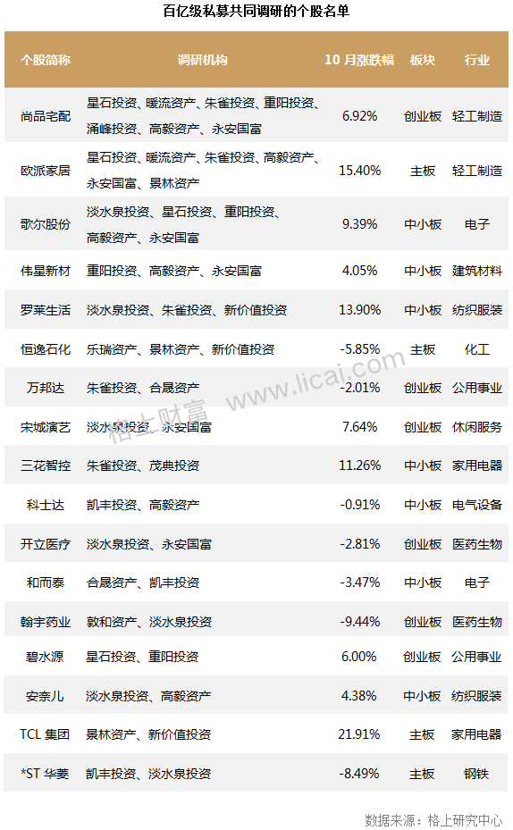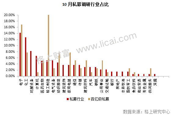 此外,在私募共同调研的个股中,涨幅最大的是“京东方A”,10月上涨41.36%,截止到10月30日该股今年总共上涨119.01%。格上研究中心发现,不论是最受关注的“歌尔股份”还是涨幅最大的“京东方A”,都同属于电子行业,“歌尔股份”主要提供消费类电声产品,“京东方A”则主营显示器件业务,两者都是行业龙头,同属于半导体产业链,在国家提出“加快发展先进制造业”的背景下,引得众私募的高度关注。