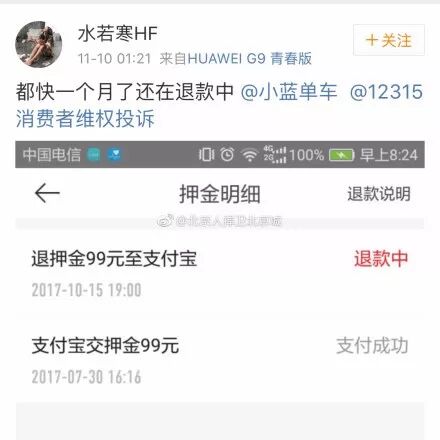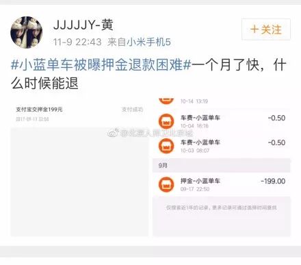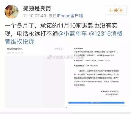 今年10月,小蓝单车曾表示“用户于2017年10月30日申请退款的款项将于11月10日前退还完毕”。然而如今,约定的退款日已过,很多用户却仍未收到退款。甚至还有网友表示,在押金没有退回来的同时,APP中的退款信息却无故“失踪了”。