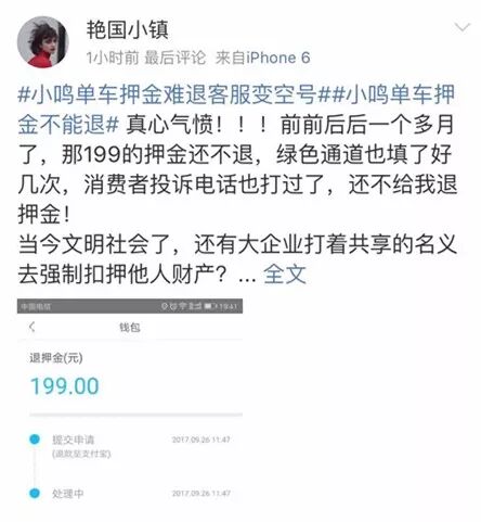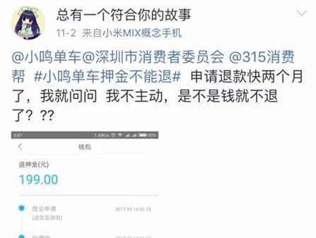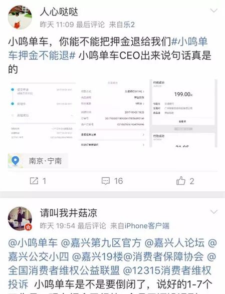 同样是从今年8月开始,多地网友反应,在小鸣单车APP上申请退还199元押金,系统提示1到7天内退还押金。然而时间过去了,押金却未退回,而拨打其APP客服电话已是空号。