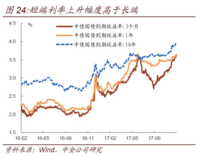 反映到市场,我们可以看到近期整体利率有所上升,尤其是短端利率近期上升也较快。过去一年,短端利率的上升幅度明显超过长端利率,导致目前收益率曲线极度平坦。虽然7天回购利率仍处于央行的利率走廊管制区间,但也主要是银银之间的7天回购利率,而加权7天回购利率已经在利率走廊之上。
