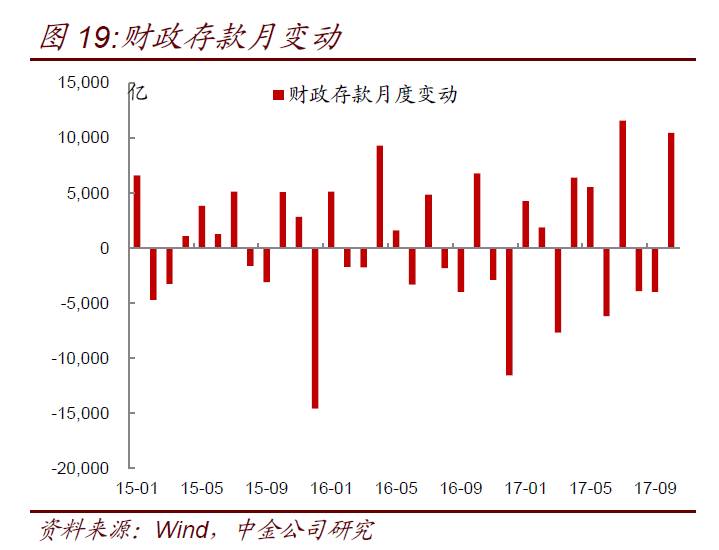 (1)下半年财政支出增速放缓,10月份财政存款大幅上升1万亿(图19),仅次于7月份的上升1.16万亿,导致银行的存款派生进一步减弱。