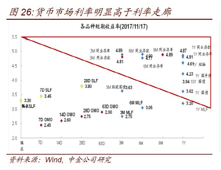 而且由于流动性的不稳定性,长期限资金相比于短期限资金需要付出更高的流动性溢价,1天利率到1年期利率是整体收益率曲线最陡的一段(图24),而1年期到10年期的利率曲线基本是平坦的(图25)。目前1个月以上的货币市场利率和短期债券利率都远高于央行的货币政策工具利率和利率走廊(图26)。这也意味着目前流动性困局最大的障碍因素在于这一段过陡的货币市场利率曲线。