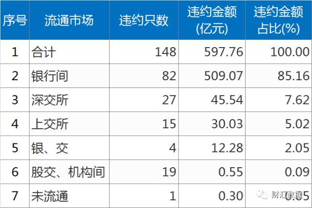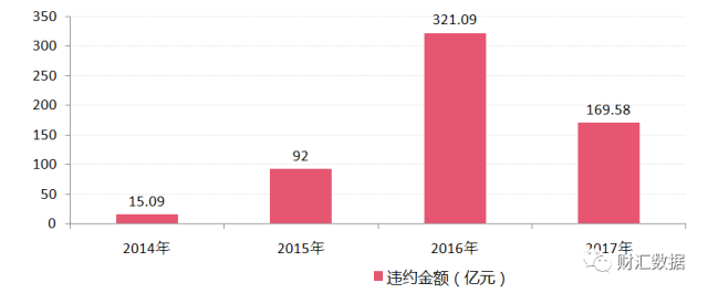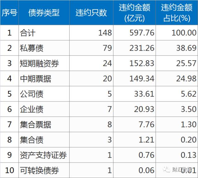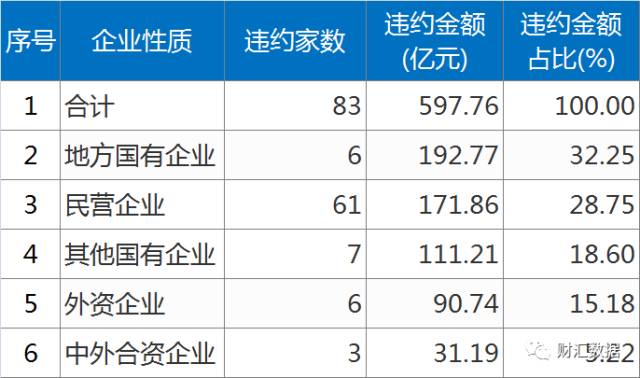 根据财汇金融大数据终端统计,截止2017年8月31日,违约债券数量共计148只,涉及违约主体83家,累计违约金额597.76亿元。