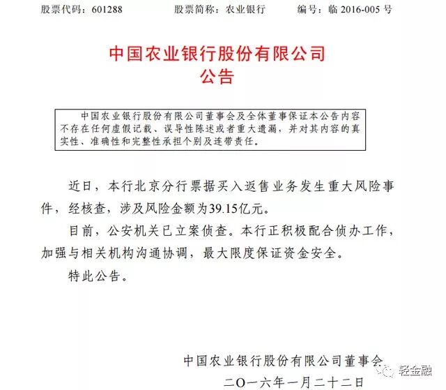 该案的爆发,源于2016年1月22日农业银行晚间发布公告:农业银行北京分行票据买入返售业务发生重大风险事件,经核查,涉及风险金额为39.15亿元。