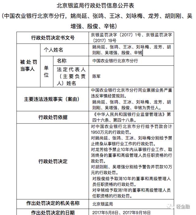 “对中国农业银行北京市分行给予罚款合计1950万元的行政处罚。