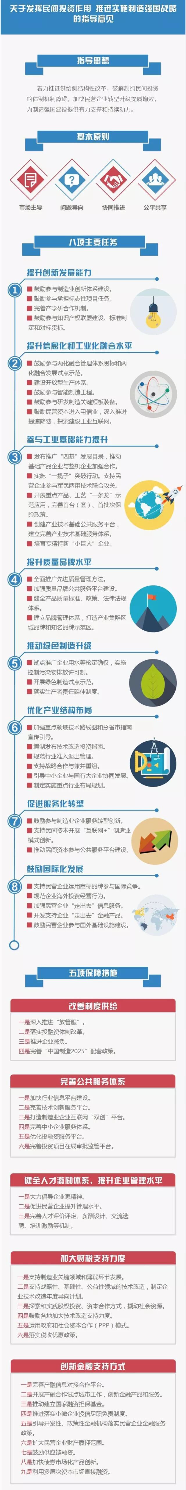 为深入贯彻落实党的十九大精神,进一步激发民间投资活力,引导民营制造业企业转型升级,加快制造强国建设,工业和信息化部、发展改革委、科技部、财政部、环境保护部、商务部、人民银行、工商总局、质检总局、知识产权局、工程院、银监会、证监会、保监会、国防科工局、全国工商联日前联合印发了《关于发挥民间投资作用 推进实施制造强国战略的指导意见》(以下简称《指导意见》)。 针对近年来制造业民间投资增速放缓、活力不强的局面,《指导意见》贯彻落实党中央、国务院关于促进民间投资工作的总体要求,围绕《中国制造2025》,通过一系列措施和保障,破解制约民间投资的体制机制障碍,发挥民营企业在制造业领域主力军和突击队的作用,激发民间投资活力,培育壮大新动能,改造提升传统产能,促进制造业向高端、智能、绿色、服务方向发展。 《指导意见》按照“市场主导、问题导向、协同推进、公平共享”的原则,从民营企业反映强烈、制约民间投资、影响提质增效升级的突出问题出发,提出了八项提升民营制造业转型升级的主要任务,鼓励支持制造业民营企业提升创新发展能力、两化融合水平、工业基础能力和质量品牌水平,推动绿色制造升级、产业结构布局优化、服务化转型以及国际化发展,指出了民营企业转型升级的方向任务和工作措施。 为保障各项工作任务落实到位,《指导意见》提出了五个方面的保障措施,包括改善制度供给,完善公共服务体系,健全人才激励体系,提升企业管理水平,加大财税支持力度以及创新金融支持方式,全方位提升对民营企业的服务水平,推动形成公平竞争的市场环境,促进制造业民营企业持续健康发展。 下一步,各相关部门将按照《指导意见》的职责分工,认真贯彻落实《指导意见》的各项任务和保障措施,共同推动形成有利于民营企业转型升级、促进民间投资的体制机制和政策环境。 图片来源工信部