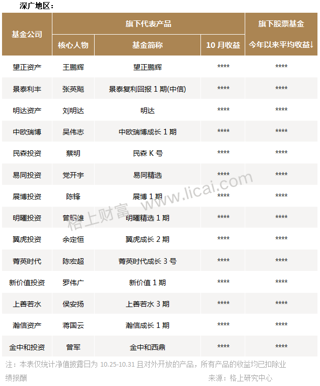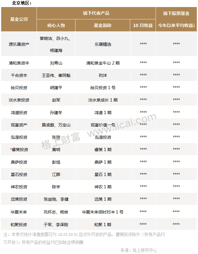 规模以上股票策略私募机构中,景林资产旗下股票型产品的平均收益为53.98%,位居榜首,其投资策略是寻找低估值或估值合理的优秀公司,今年以来低估值的优秀公司实现了估值修复和公司成长两个方面带来的丰厚收益,主要布局了受益于消费升级、制造业升级相关的个股,包括大消费、大金融以及科技板块个股。此外,北京地区的源乐晟资产和深广地区的望正资产也取得了不错的收益,今年以来分别上涨47.26%和44.91%。