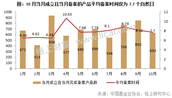 从备案时间来看,10月当月成立的产品平均备案时间为7.7个自然日,较9月备案时间有所缩短。