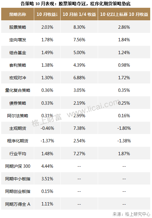 整体来看,10月私募行业平均收益为1.48%,今年以来私募行业平均收益为10.52%。