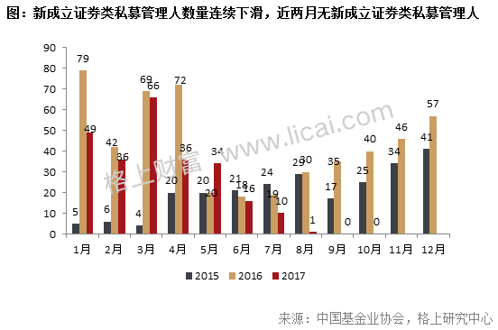 据基金业协会最新数据显示,截至目前已在协会备案的私募管理人中,证券类私募管理人自3月份新成立66家达到今年以来最高点,之后的几个月新成立数量连续下滑,8月仅1家证券类私募管理人成立,并于10月30日备案,9、10两月暂无新成立的证券类私募管理人。