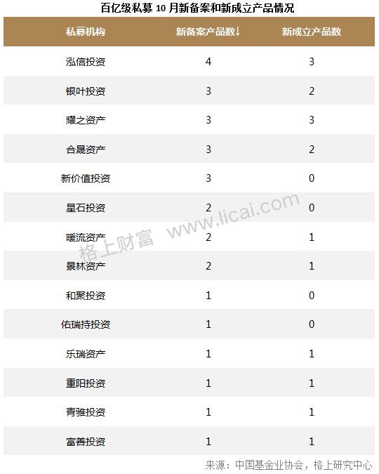 2、10月共14家百亿级私募新备案产品28只,泓信连续6月每月至少发行3只产品