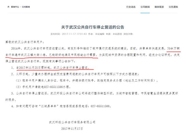 11月17日,武汉环投在其微信公众号“江城易单车”以及官方网站上发布了一则《关于武汉公共自行车停止营运的公告》称: