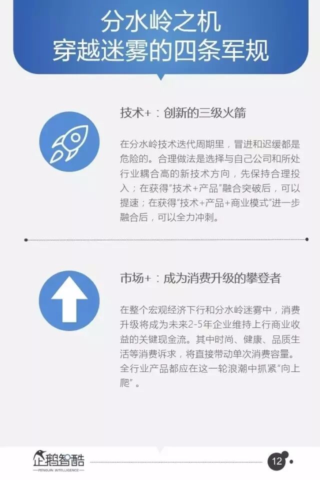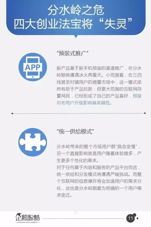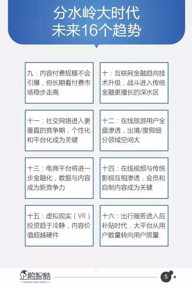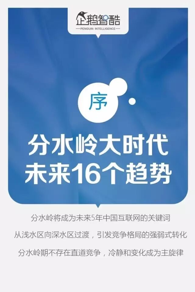 来源:企鹅智酷分水岭将成为未来5年中国互联网的关键词,从浅水区向深水区过渡,引发竞争格局的强弱式转化。分水岭期不存在直道竞争,冷静和变