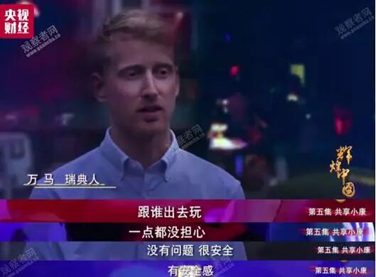 对于中国的安全感,有两位外国小哥曾在今年9月24播出的《辉煌中国》第五集《共享小康》中现身说法,“跟谁出去玩,一点都不担心”,“ 中国非常安全,我已经跟父母说我不回去了。”