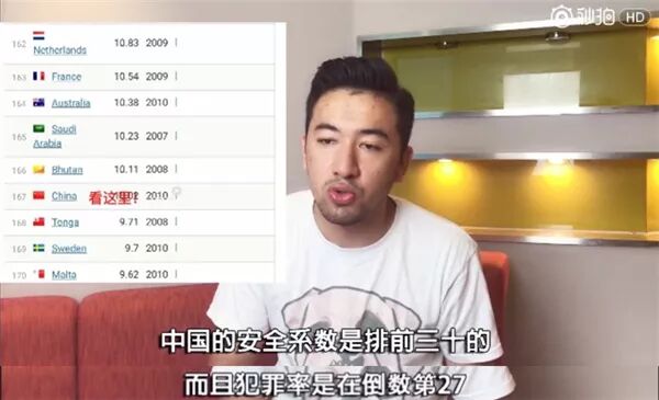 马克Malik在视频中还列出了数据:在全球200多个国家和地区中,中国的安全系数排前三十,犯罪率排倒数第27,而且犯罪率正在逐渐减少。