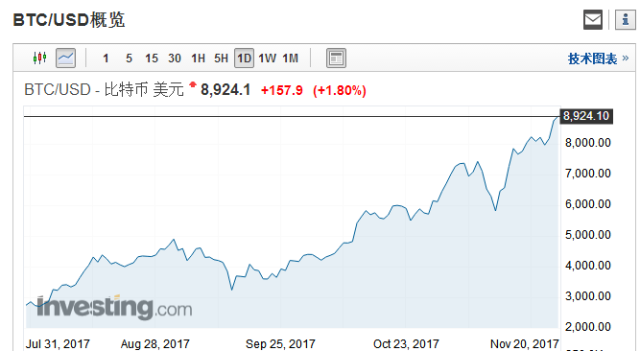 截止到2017年11月26日,比特币的价格已经接近9000美元一枚!