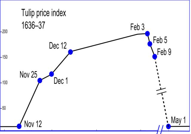 根据维基百科的郁金香价格指数,从1636年11月开始到1637年2月份左右,最高涨幅达到200倍!