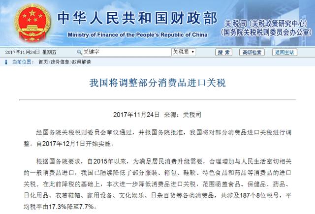 就在美国“黑色星期五”席卷全球的时候,我国财政部网站发出消息:将对部分消费品进口关税进行调整的消息,自2017年12月1日开始实施。