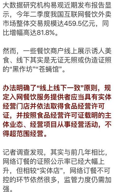 近日,国家食品药品监督管理总局发布《网络餐饮服务食品安全监督管理办法》,要求网上餐饮应当具有实体经营门店并依法取得食品经营许可证,同时加强对送餐人员和配送过程的规范。