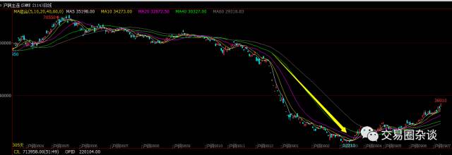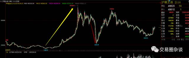 如图所示:在2008年1月假如能够准确判断未来铜将进入熊市,那么企业从70200到22210,相信很多企业在这之间的日子肯定不会好过,如果你对趋势可以有效判断的话,那么你可以在重要的转折点做大量的买期或者卖期保值,从而有效地降低自己的采购成本,从而有效的规避价格暴跌给你企业带来的巨大损失。可见套保团队有多么重要,在牛熊交替之际挽救企业与水火之中。