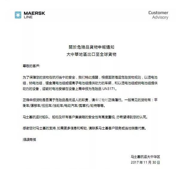 马士基关于危险品货物申报通知尊敬的客户:为了保障您的货物在航行当中的安全,我们特此提醒,根据国际海运危险货物规则,以湿电池组,钠电池