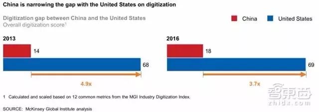 总的来看,中国的数字化产业经济落后于发达国家,但正在迅速缩小差距(2013年美国数字化程度是中国的4.9被,2016年降至3.7倍)。此间 ,政府的政策支持(互联网+产业、智造产业等)和投资推动(IT基础设施等)起了很大的作用。