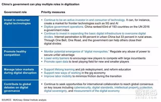 此外,政府还推动着数据的的开放,使数字化进程中的企业竞争更加公平(在全球144个国家的数据开放排行榜中位列71)。麦肯锡认为,政府还需要针对人口年龄结构和数字化需求,设计过渡计划,构建终生学习体系,鼓励再学习和再就业,尝试零工经济等,避免数字化进程中的工种不适应性和劳动力市场的诸多问题。